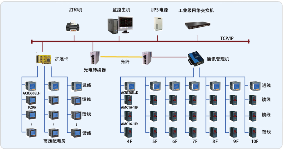 整個系統(tǒng)采用分布式結(jié)構(gòu),在上海東方電視臺變電所監(jiān)控室放置監(jiān)控主機及通訊采集裝置,現(xiàn)場各回路的儀表采用屏蔽雙絞線以總線型方式連接至通訊采集裝置,通訊管理機連接至交換機,其中劇場中設(shè)備用光纖連接至監(jiān)控室。