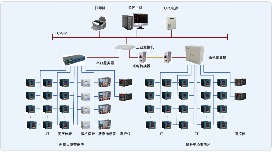 本項目監(jiān)控范圍為健身中心變電所的T1、T2變壓器的低壓進(jìn)線柜、聯(lián)絡(luò) 柜、饋線柜和創(chuàng)意大廈變電所的T3、T4變壓器的低壓進(jìn)線柜、聯(lián)絡(luò)柜、饋線柜及高壓側(cè)儀表進(jìn)行遠(yuǎn)程實(shí)時監(jiān)控和電能管理直線距離約230米。