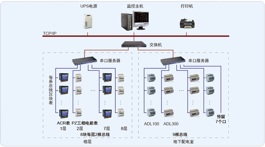 黑龍江省大豆乳品研發中心電能管理系統的監控范圍為地下二層配電間采用的ACR網絡電力儀表和PZ三相電能表共182臺,地上八樓層配電箱采用的ADL100和ADL300導軌式電能表共321塊。系統應用分布式網絡結構,采用32根屏蔽雙絞線將設備層的儀表連接至通訊層的兩臺16口串口服務器,又通過TCP/IP將數據上傳至監控層的工業計算機進行采集、分析、存儲。