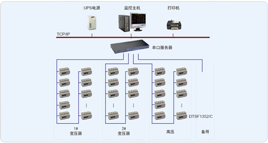 該現(xiàn)場為高壓10kV和0.4KV低壓配電室,共53塊儀表多功能智能儀表( DTSF1352/C),監(jiān)控值班室位于變電所隔壁,通過組態(tài)軟件Acrel-2000實(shí)現(xiàn)對現(xiàn)場儀表的實(shí)時(shí)監(jiān)測,并記錄歷史數(shù)據(jù)自動(dòng)生成報(bào)表,以便查詢。為滿足配電室統(tǒng)一監(jiān)控的要求,配電現(xiàn)場安裝的安科瑞公司網(wǎng)絡(luò)電力儀表通過屏蔽雙絞線手拉手式相連至后臺(tái)主機(jī)內(nèi)的工業(yè)串口卡,實(shí)現(xiàn)對現(xiàn)場數(shù)據(jù)的采集,存儲(chǔ),處理,實(shí)時(shí)顯示以及歷史查詢。