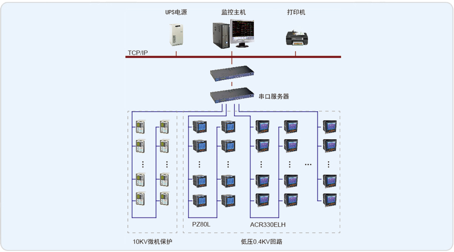 10kV回路的進(jìn)線和饋線配有微機(jī)保護(hù)裝置;0.4kV進(jìn)線和母聯(lián)回路裝有ACR330ELH電網(wǎng)質(zhì)量分析儀,采集回路的常規(guī)電參量、四象限電度和電網(wǎng)質(zhì)量參數(shù);0.4kV饋線回路裝有PZ80L系列多功能電力儀表,采集回路的常規(guī)電參量和四象限電度。本系統(tǒng)儀表集中,所以均通過(guò)屏蔽雙絞線手拉手相連數(shù)據(jù)上傳至監(jiān)控主機(jī)。
