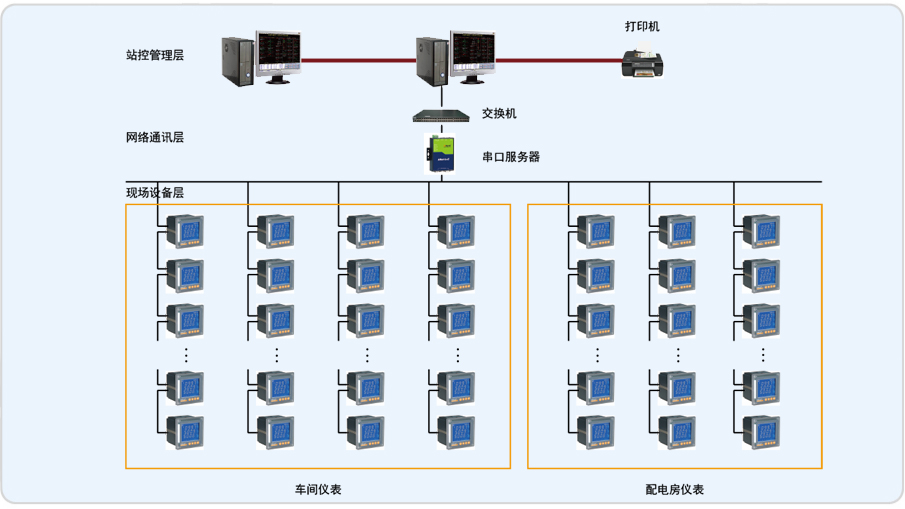整個低壓配電系統(tǒng)包括20個低壓配電柜。其中三個進線柜,三個電容補償柜,兩個母聯(lián)和12個出線柜,12個出線回路的負載基本上是三相大功率電機。各配電柜內(nèi)安裝有本公司PZ80L-E4/C 儀表共80只。整個系統(tǒng)分11根總線接入工業(yè)級串口服務器,組網(wǎng)至電力監(jiān)控系統(tǒng)。