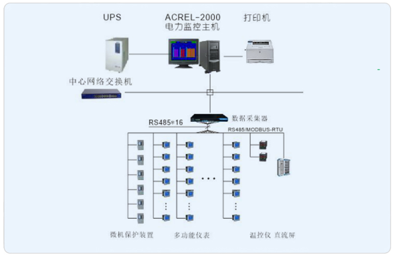 系統采用Acrel-2000型電力監控系統,分別在利爾達和利合達各設置一套電力監控系統,實現對高低壓配電回路的實時監控,有利于用電管理。另一方面,電力監控系統不僅能夠準確的表示出回路的用電狀況,它還具備網絡通訊等功能,能夠與計算機、串口服務器等設備進行組合,從而實現遠程監控。